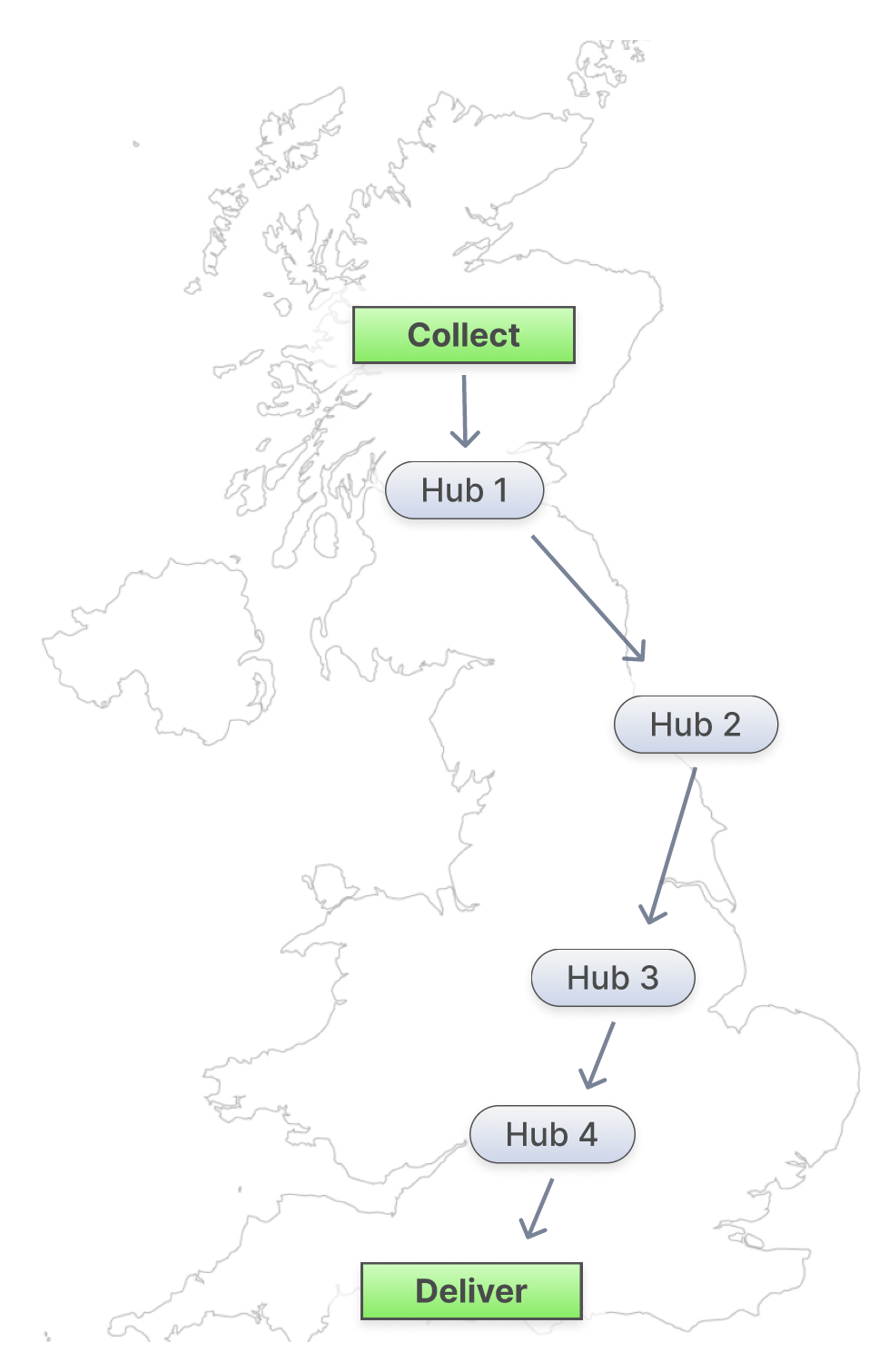A job can also be split into multiple legs, e.g. collect from A, take to hub 1, then to hub 2, then finally deliver to D. Hubs are storage points dotted around the country.