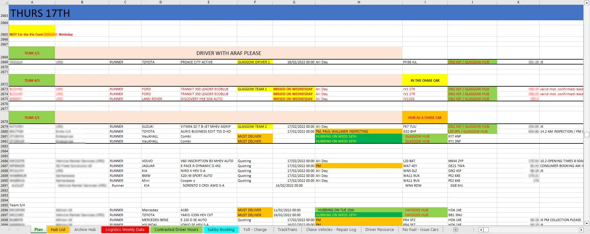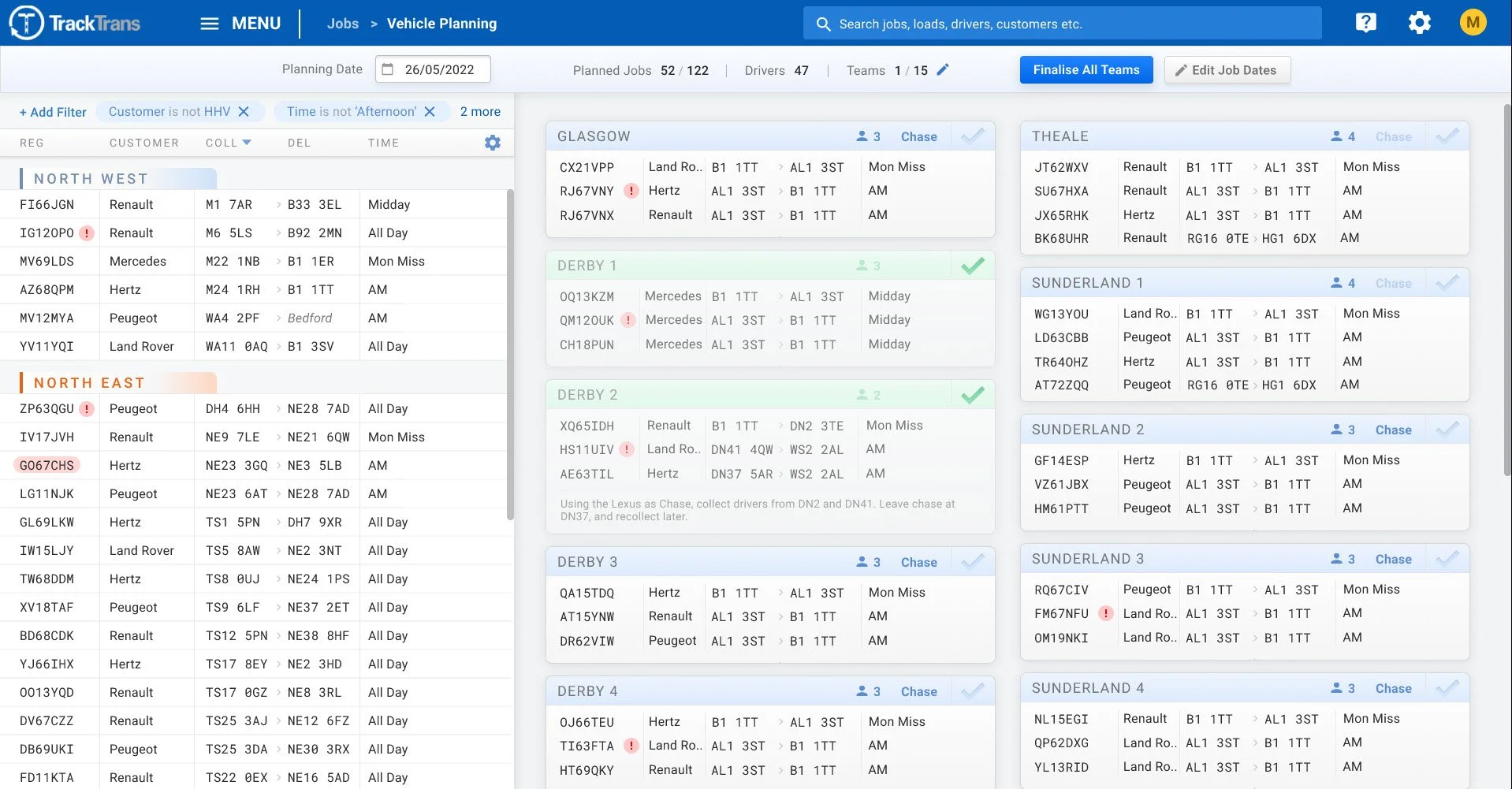 After the interview, my next step was to spend a day at the customer’s premises observing the real planning operation as it happened. Here I saw many of the edge-cases which come up, one being that ‘non-runner’ jobs, i.e. cars which cannot be driven and need a truck to transport them, must be put on the correct team and if this does not happen then a driver might turn up to a non-runner car/job expecting to drive it and not being able to, wasting time and money. Therefore non-runner jobs should be marked very prominently in the UI.
