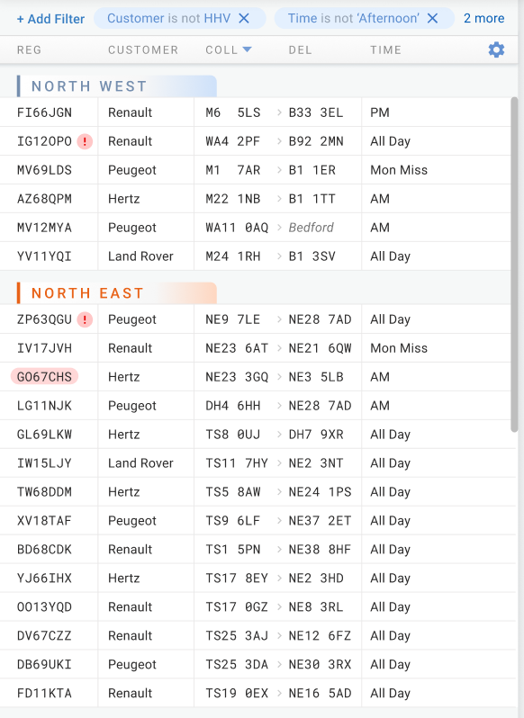 To aid comparison of postcodes and scannability (in the Collection and Delivery columns) I used a monospaced font. Hubs, for example ‘Bedford’ in the Del column (see below), are visually distinguished too.